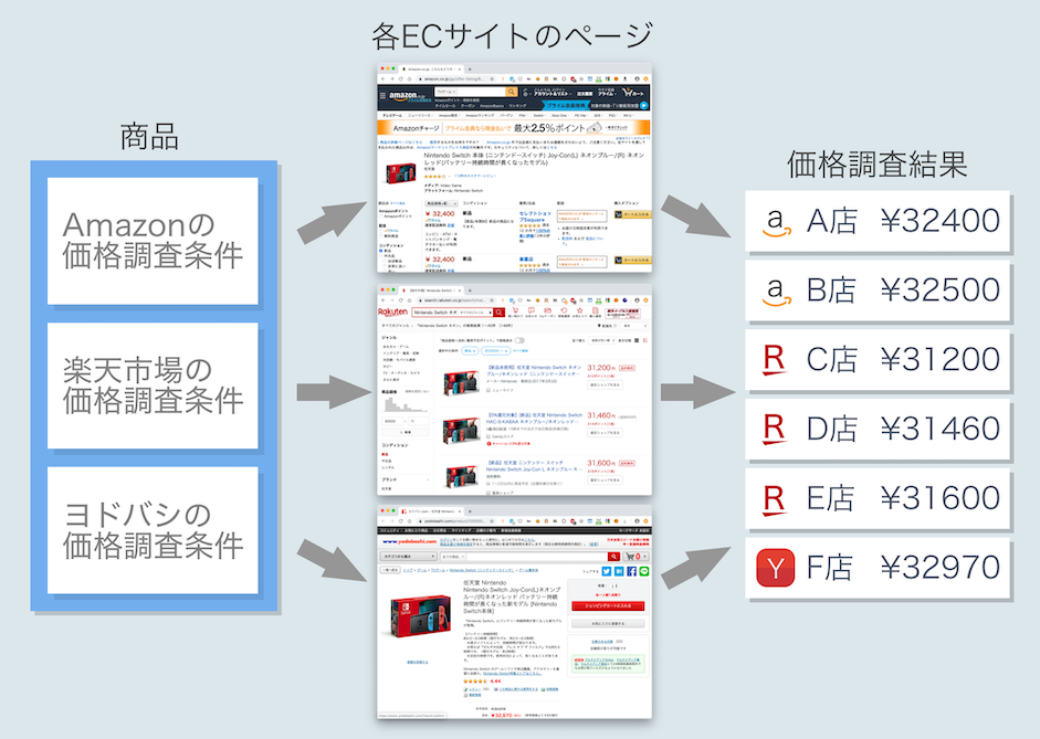 設定された価格調査条件に従って、プライスサーチは定期的に各ECサイトを検索し、検索結果に表示されている販売商品と価格情報を収集します。