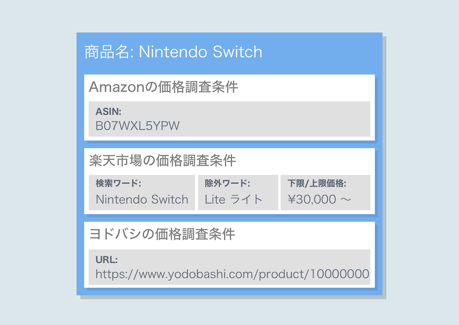 商品には、各ECサイトで価格を検索するための価格調査条件を設定します。